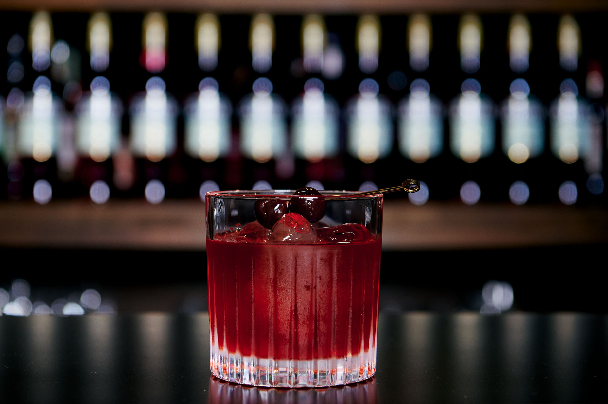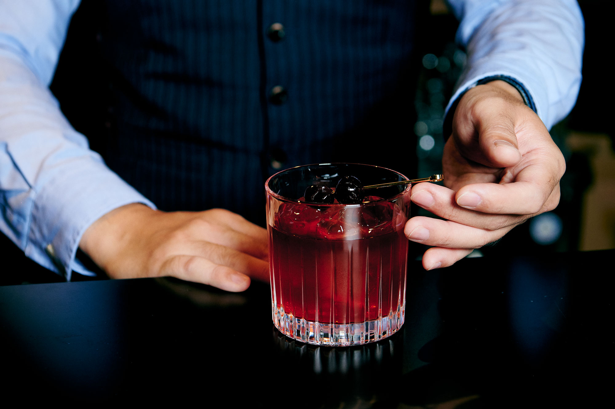 そこに、「アマレナチェリー」というイタリアのブラックチェリーのシロップ漬けを加えています。これにより甘味の骨格が形成されます。ネグローニはフィレンツェ発祥のカクテルですので、イタリアらしい豊かな風味を感じていただきたいと思い作りました。